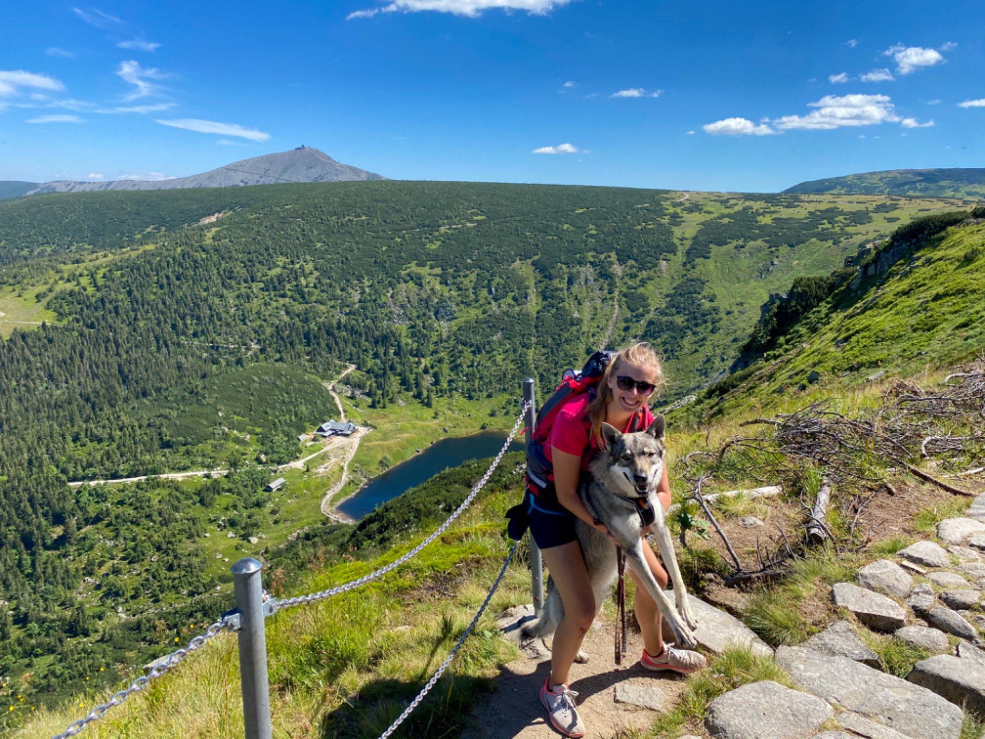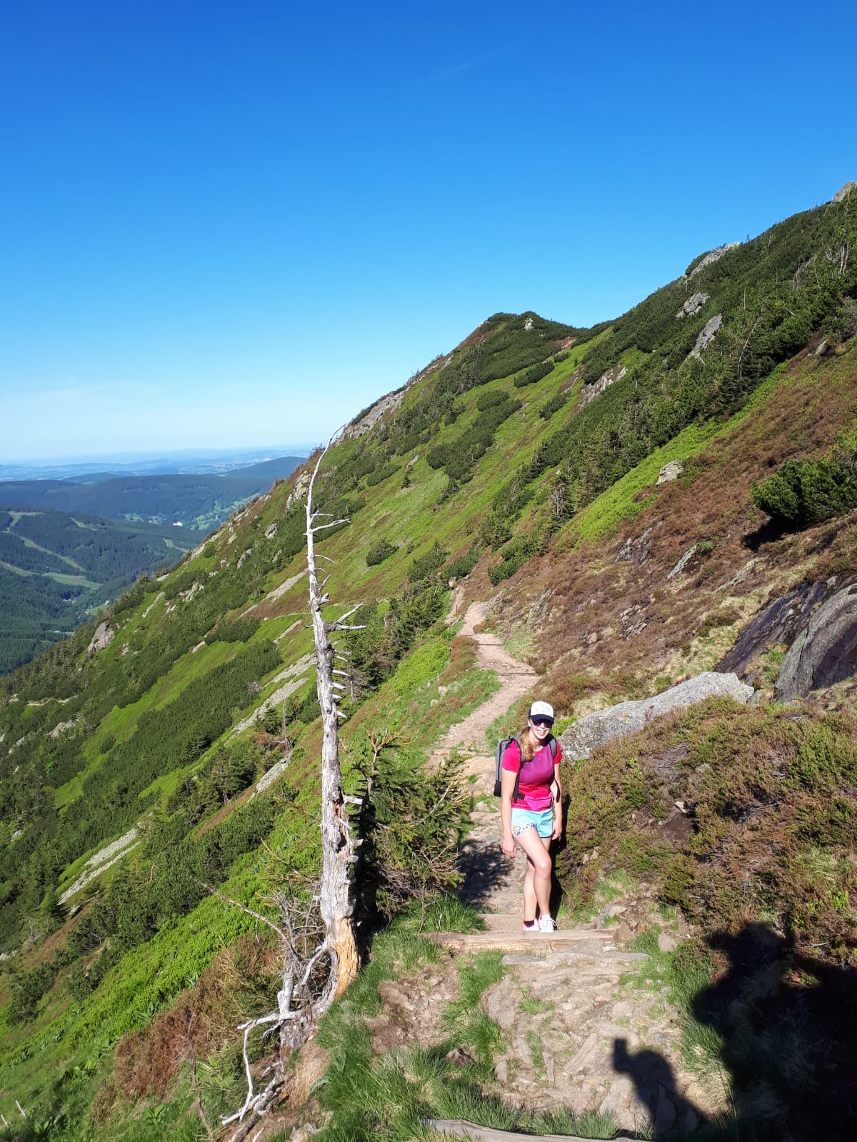 Vyrazili jsme brzy ráno ze Špindlu a už něco málo kolem deváté jsme byli nahoře na vyhlídce u Kozích hřbetů. Trasa začala hnedka z prudka do kopce a vedla po takové silnici, poté jsme odbočili do lesa a tam začalo dobrodrůžo. Schody, které byly celkem vysoké, takže to byl docela záhul - dle mého, ty schody byly snad stavěné pro...